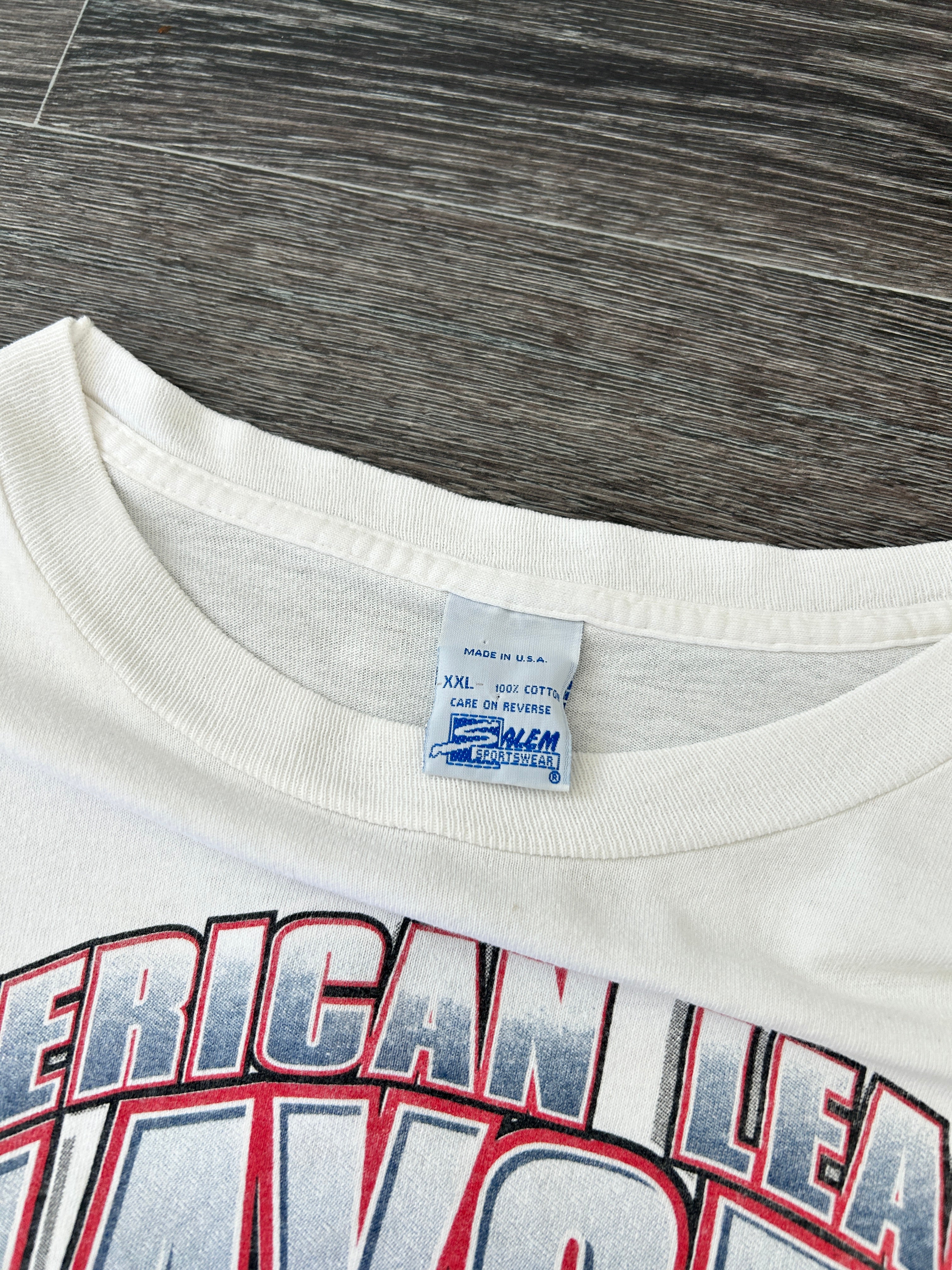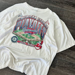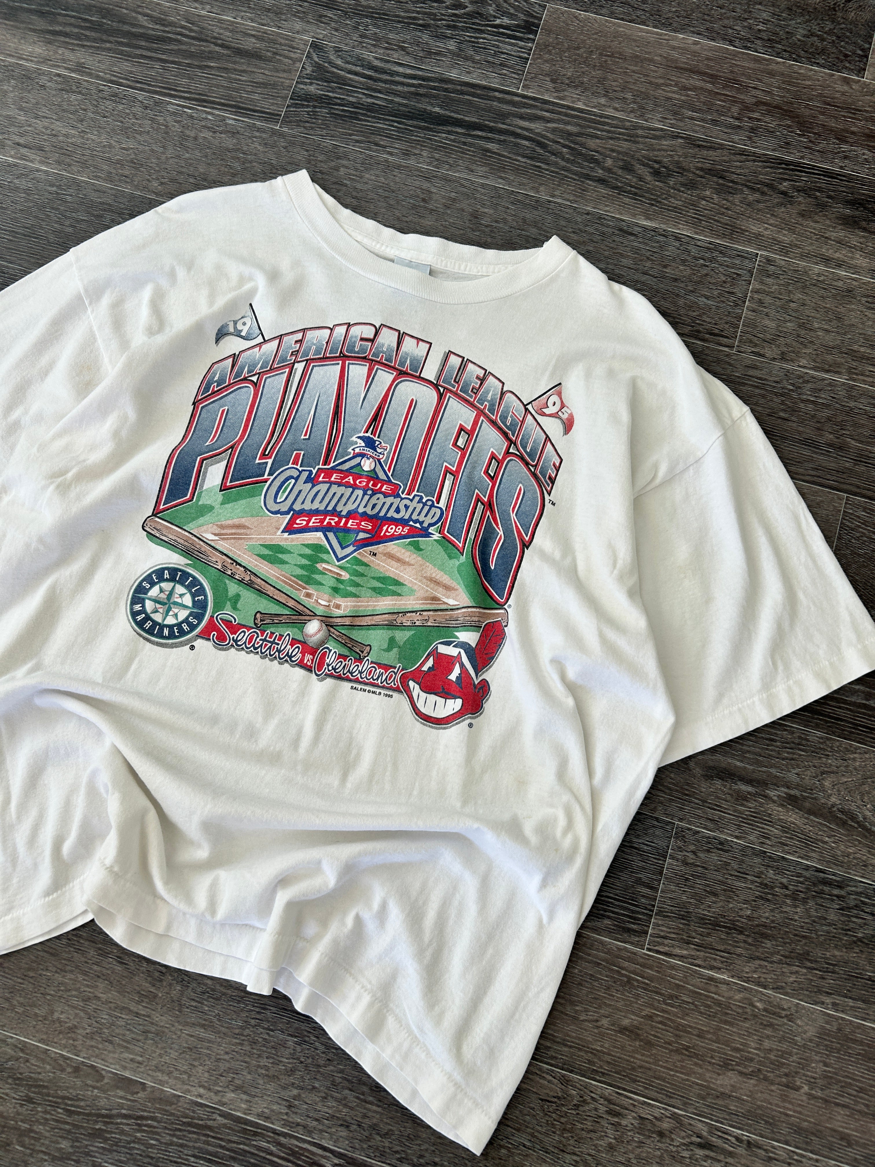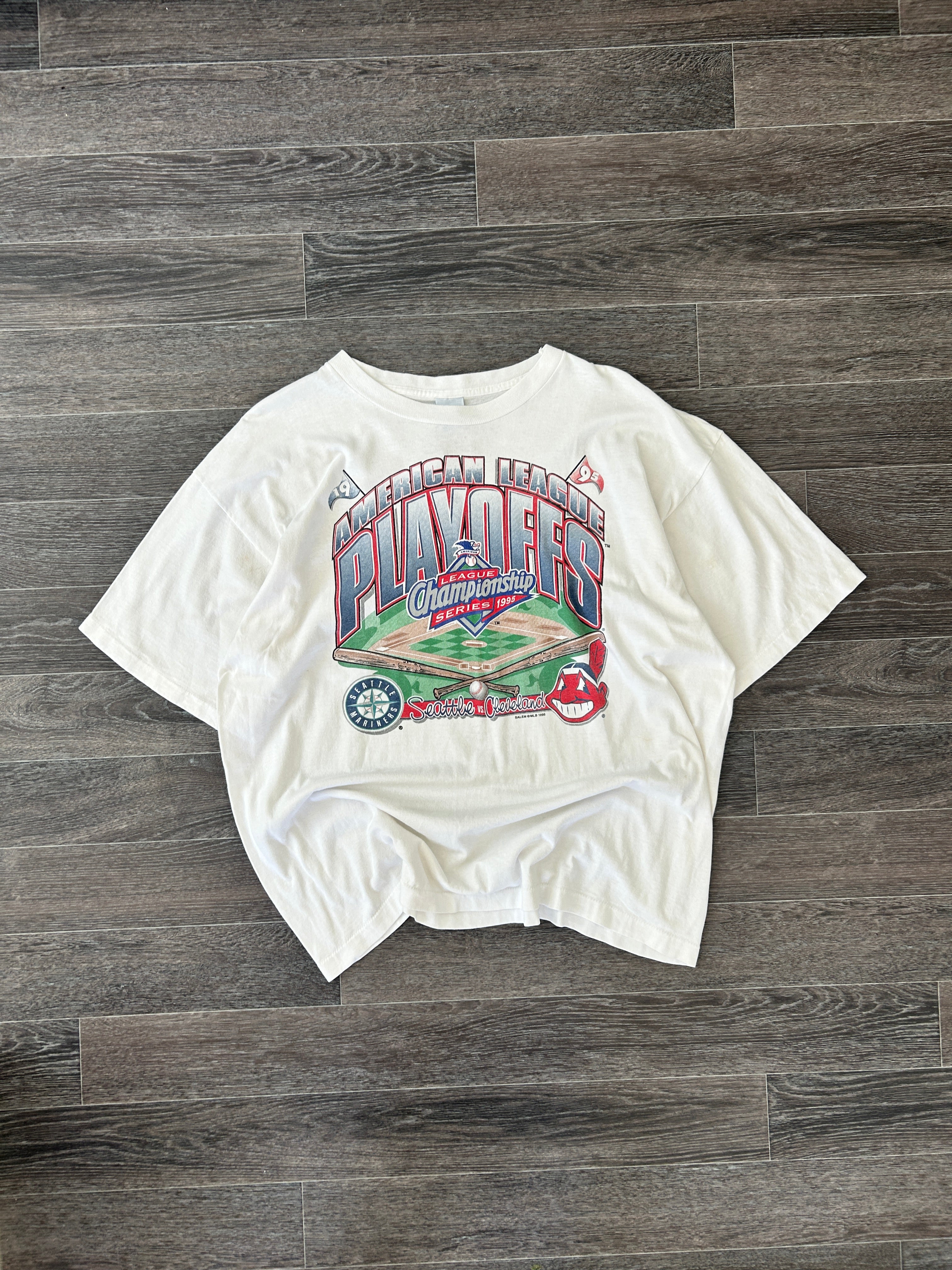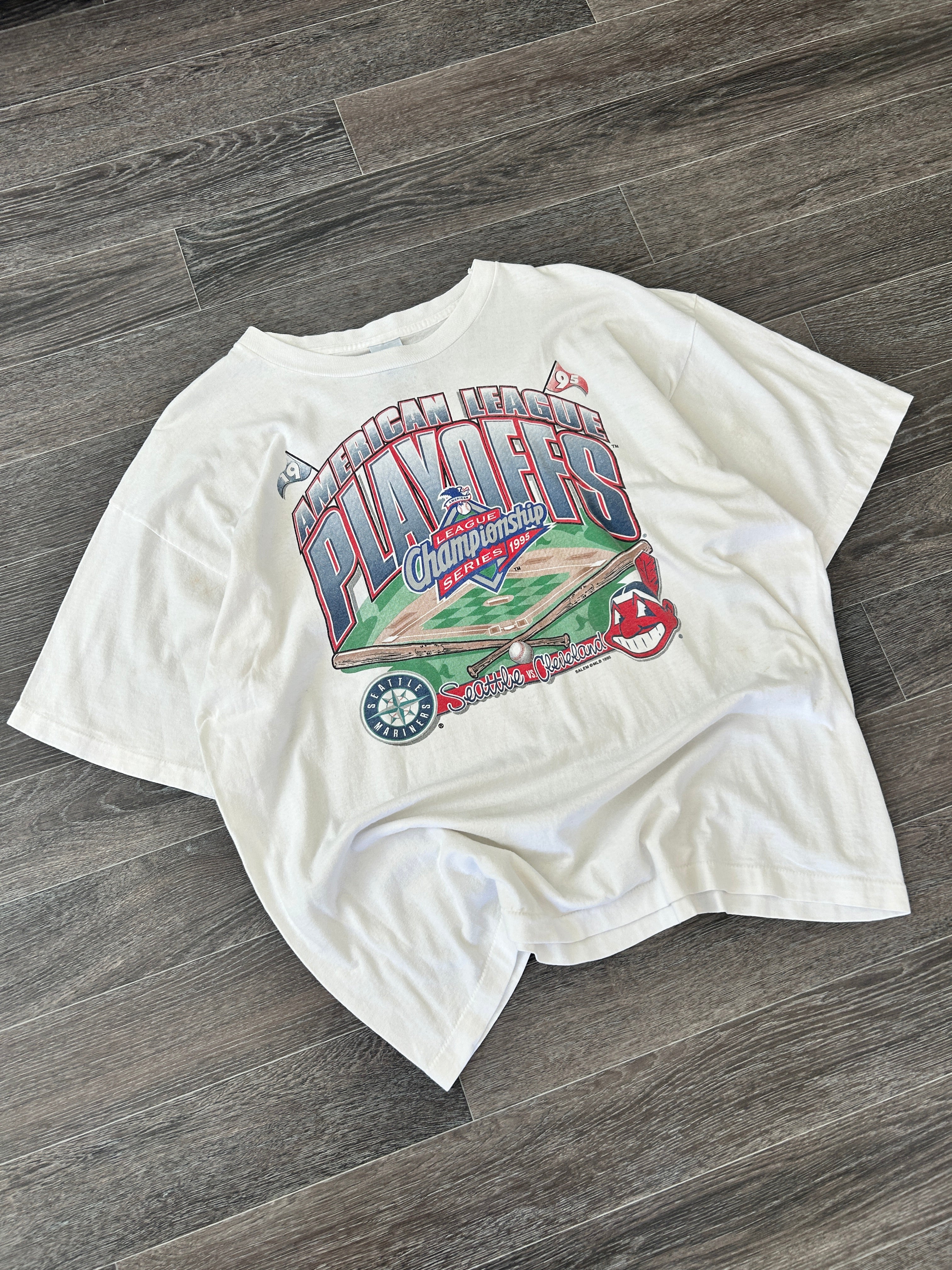 Vintage 1996 Salem Sportswear Made in USA 100% Cotton American League Playoffs Seattle vs Cleveland MLB Baseball Graphic Tee
